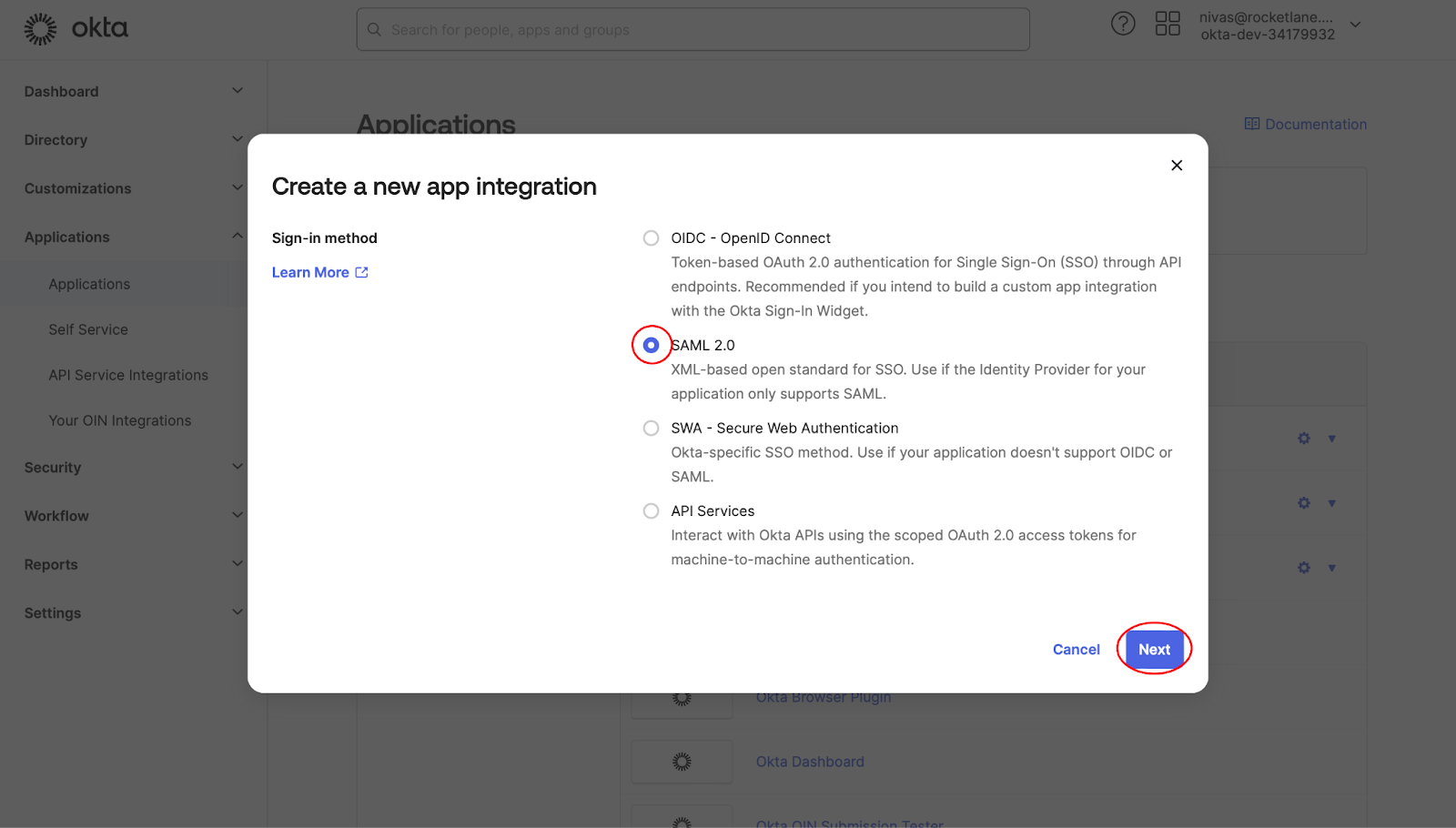 Select SAML 2.0: In the pop-up window, select SAML 2.0 and click Next. This will open the page to configure your SAML integration.