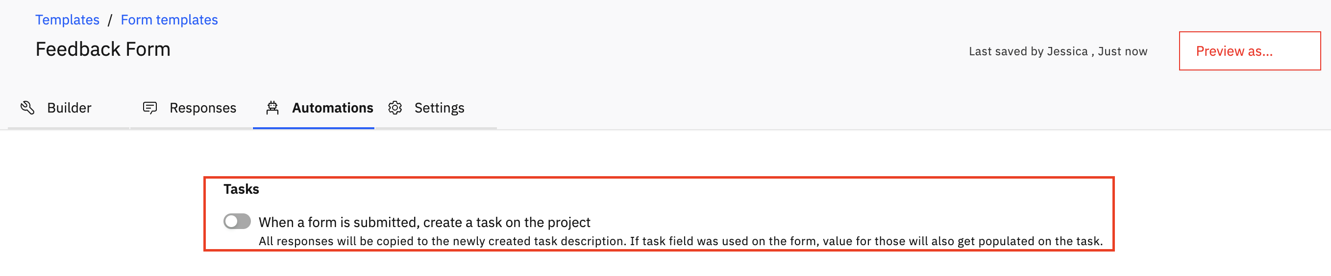 You can automatically create a task in Rocketlane when each form is submitted, the responses will be copied to the description section of the newly created task. If task field was used on the form, values for those will also get populated in the task's info section.