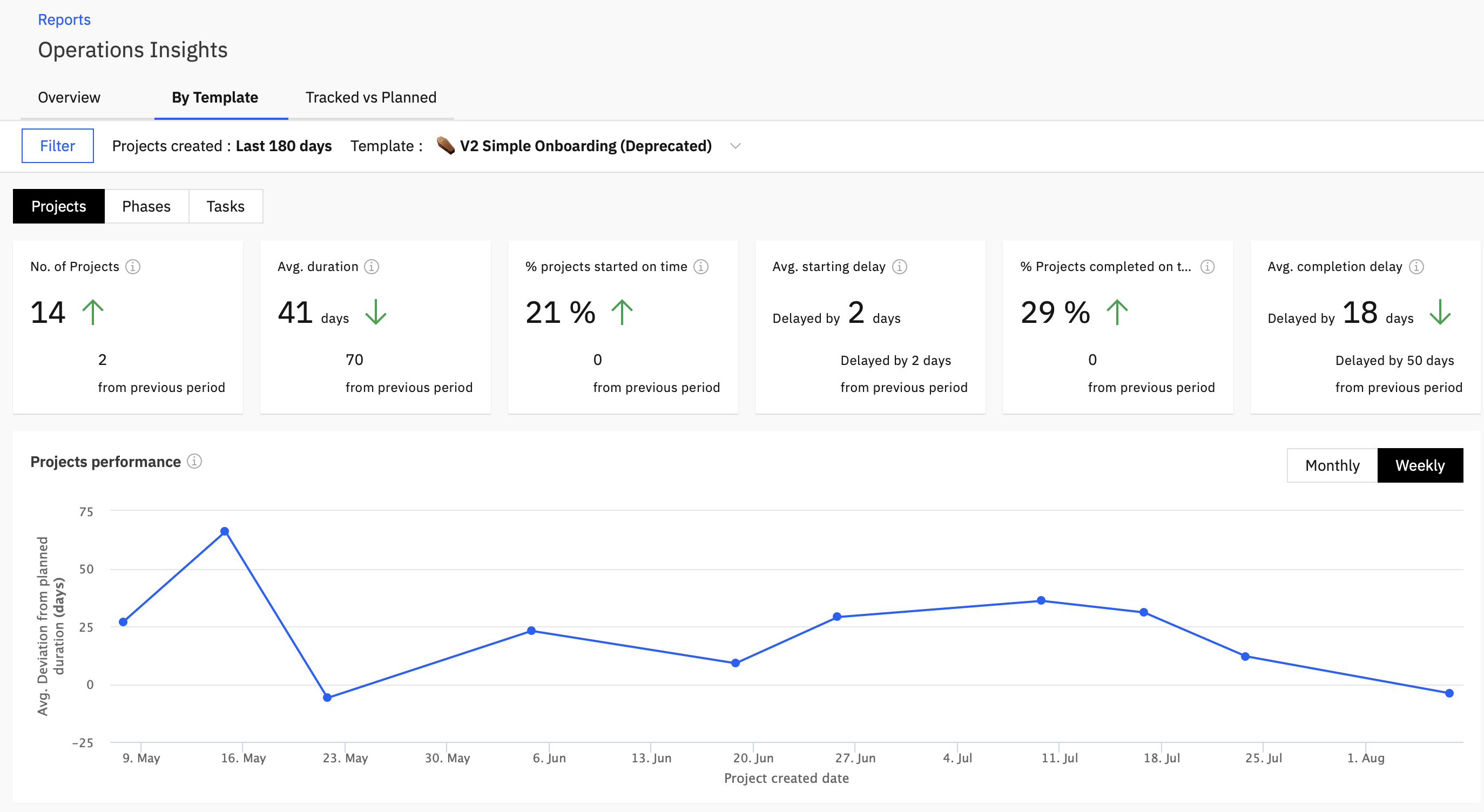 Depending on the view you select, you can hover over the data points for each month/ week and get the number of projects created during that month/ week and the average deviation from the planned duration in number of days.