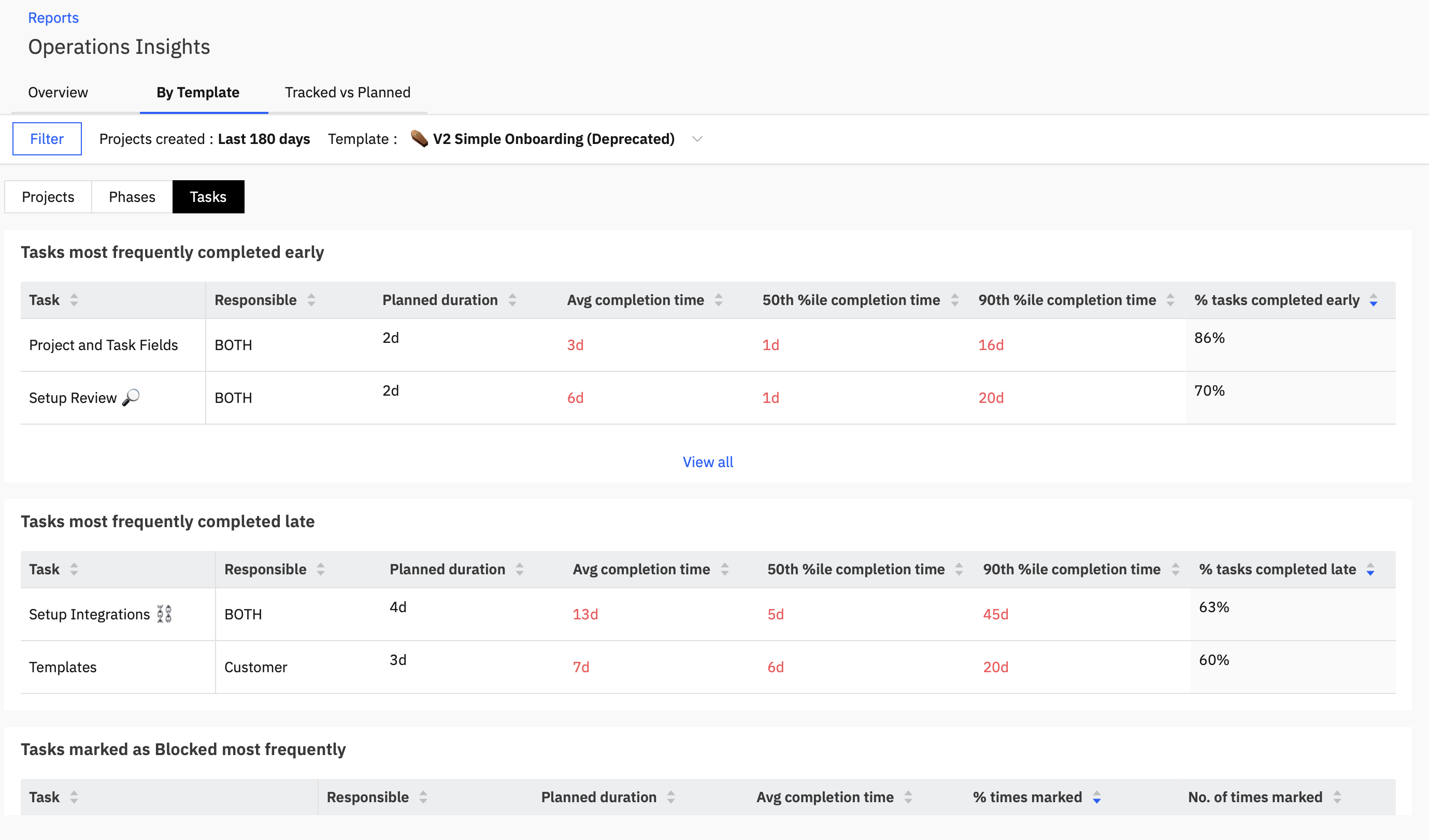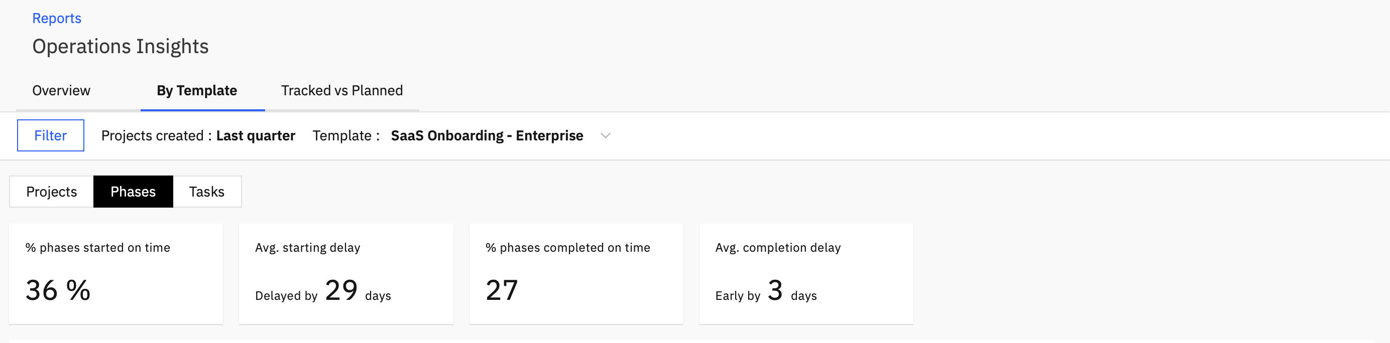 This tab gives you an overview of the planned vs actual completion time, starting delays and ending delays of the projects that have been created using a certain template and also for their respective phases and tasks.