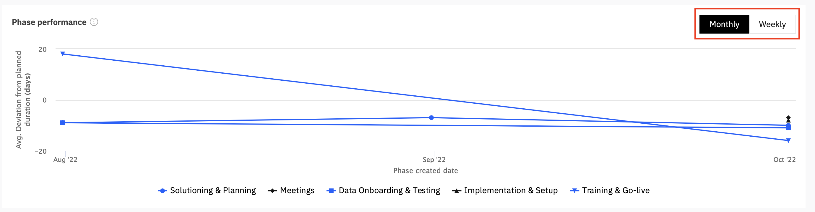 Depending on the view you select, you can hover over the data points for each month/ week and get the number of phases created during that month/ week and the average deviation from the planned duration in number of days.
