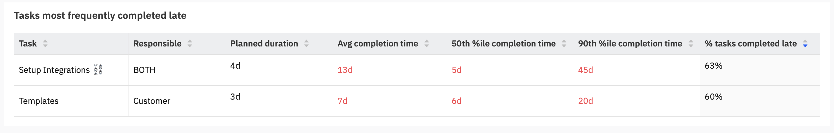 Tasks most frequently completed late: Table