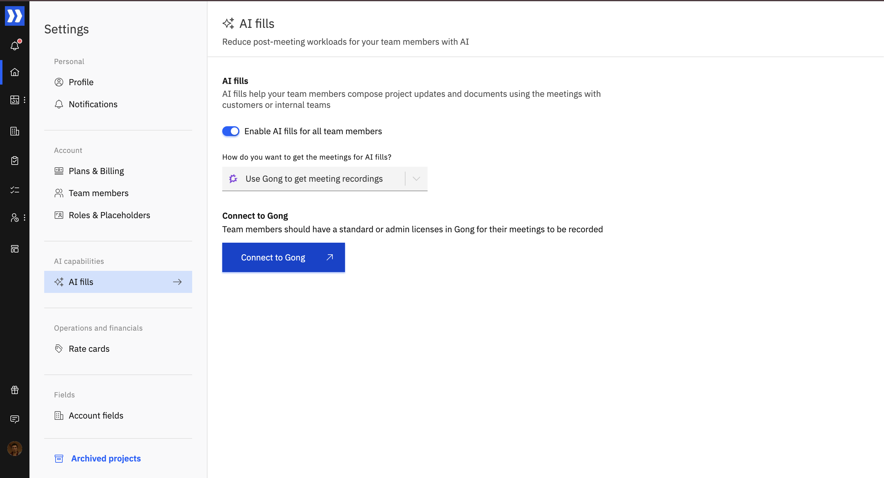 Navigate to Settings -> AI Capabilities -> AI fills and choose “Use Gong to get meeting recordings”