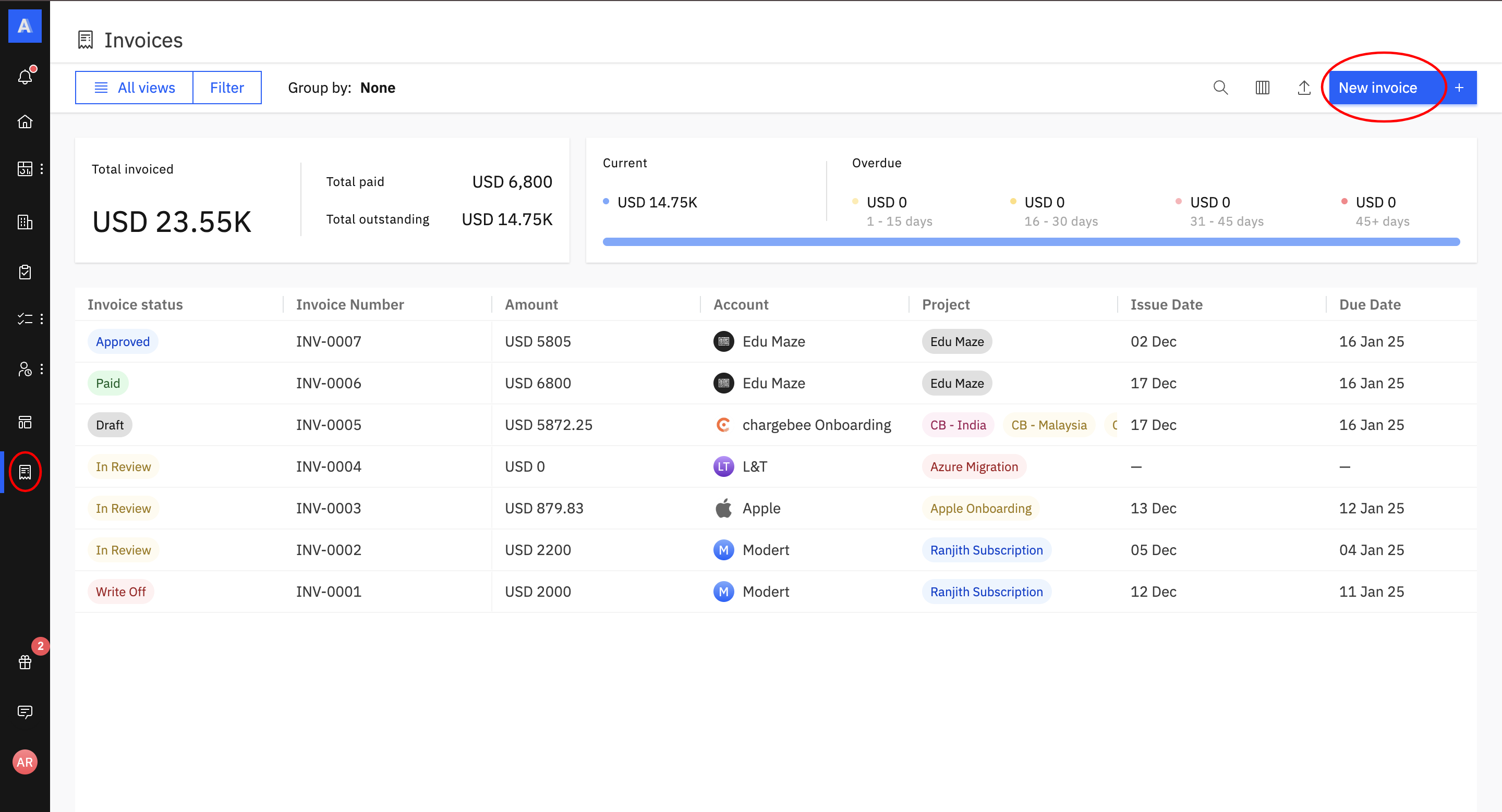 You can access an invoice in draft from the Invoice list page and send it for review.