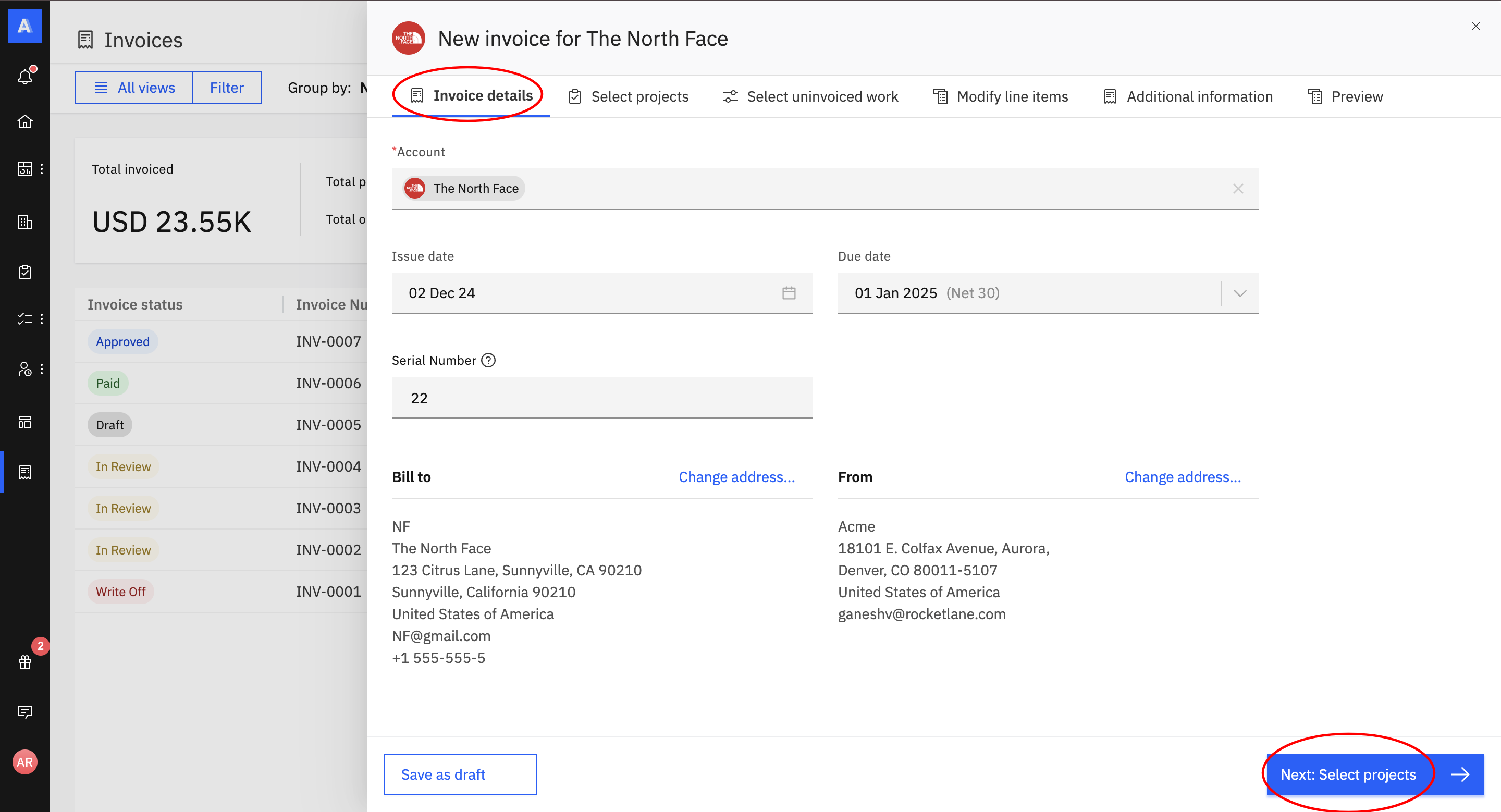 If you use any custom fields for your invoice, ensure that this information is filled in before selecting the projects to be invoiced. Custom fields could include details like PO number, payment method or specific terms, which help personalize and clarify the invoice.