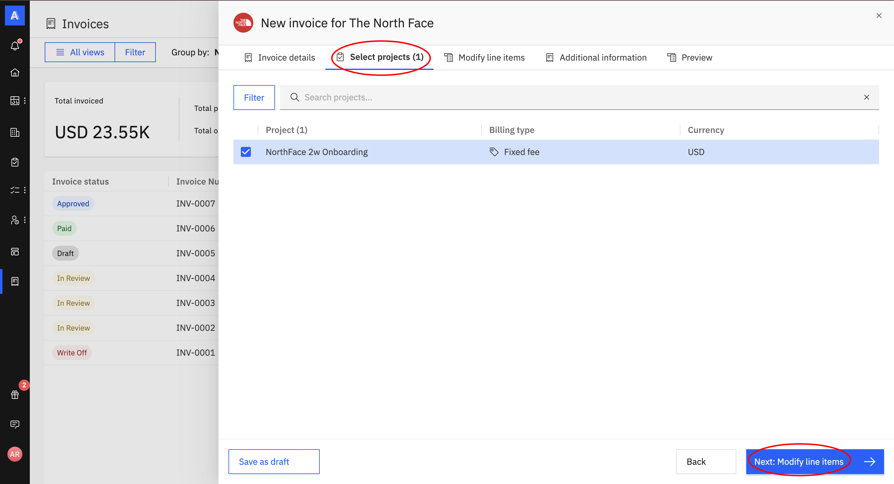 Based on the customer account you select, all in-progress and completed projects for that customer will be displayed. To help you choose the right projects for invoicing, you can filter projects by billing type, project name, and other criteria.