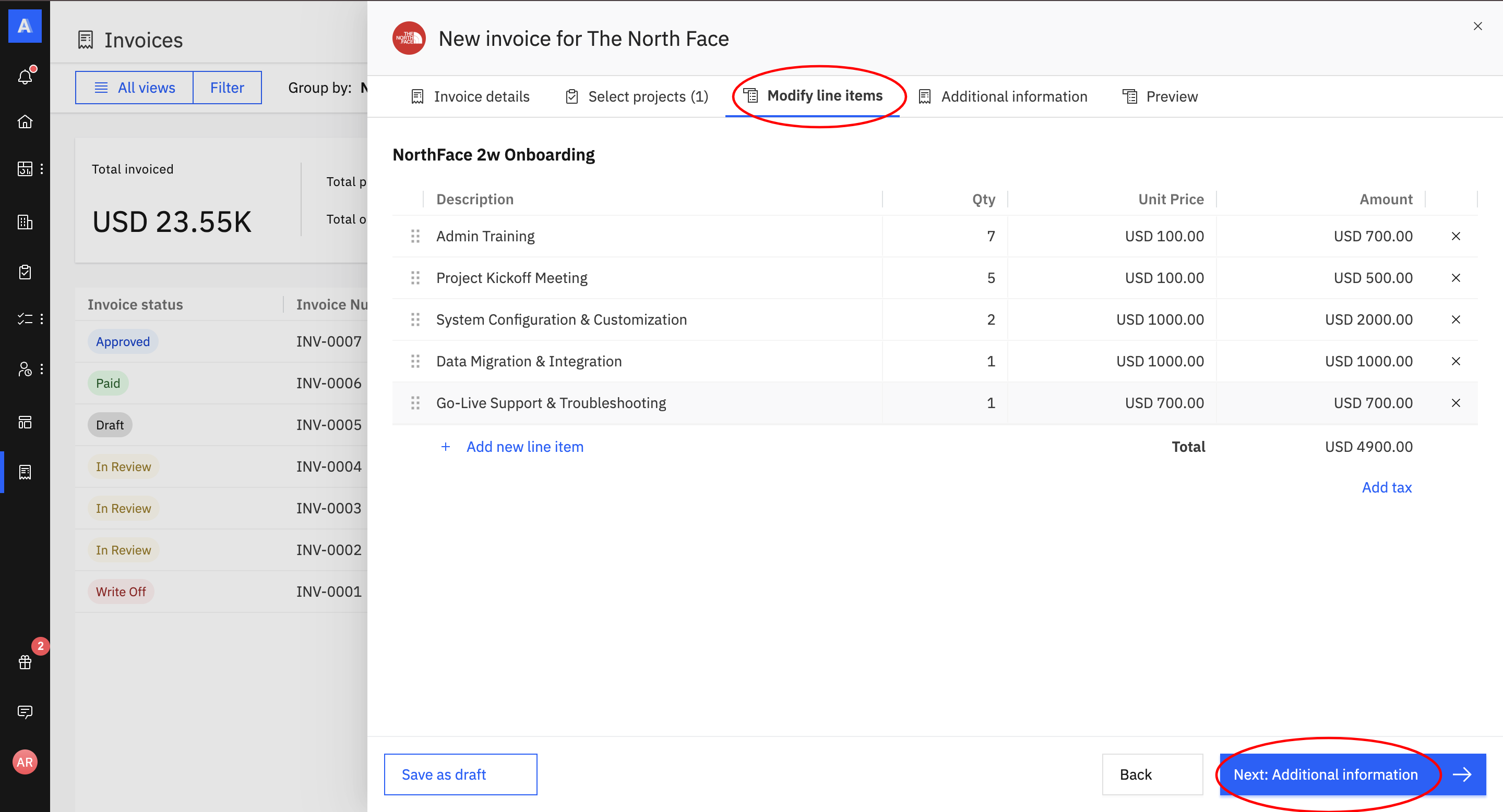 Time and Material Billing: For projects with a T&M billing type, the time entries associated with tasks where time was tracked will be available. You can select the specific items to include in the invoice.