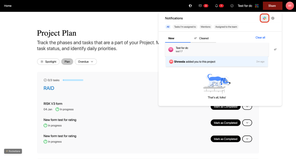 Rocketlane’s Slack integration allows your team members to get notified about project-related activities on your organization's respective Slack channel. With this integration, team members can: