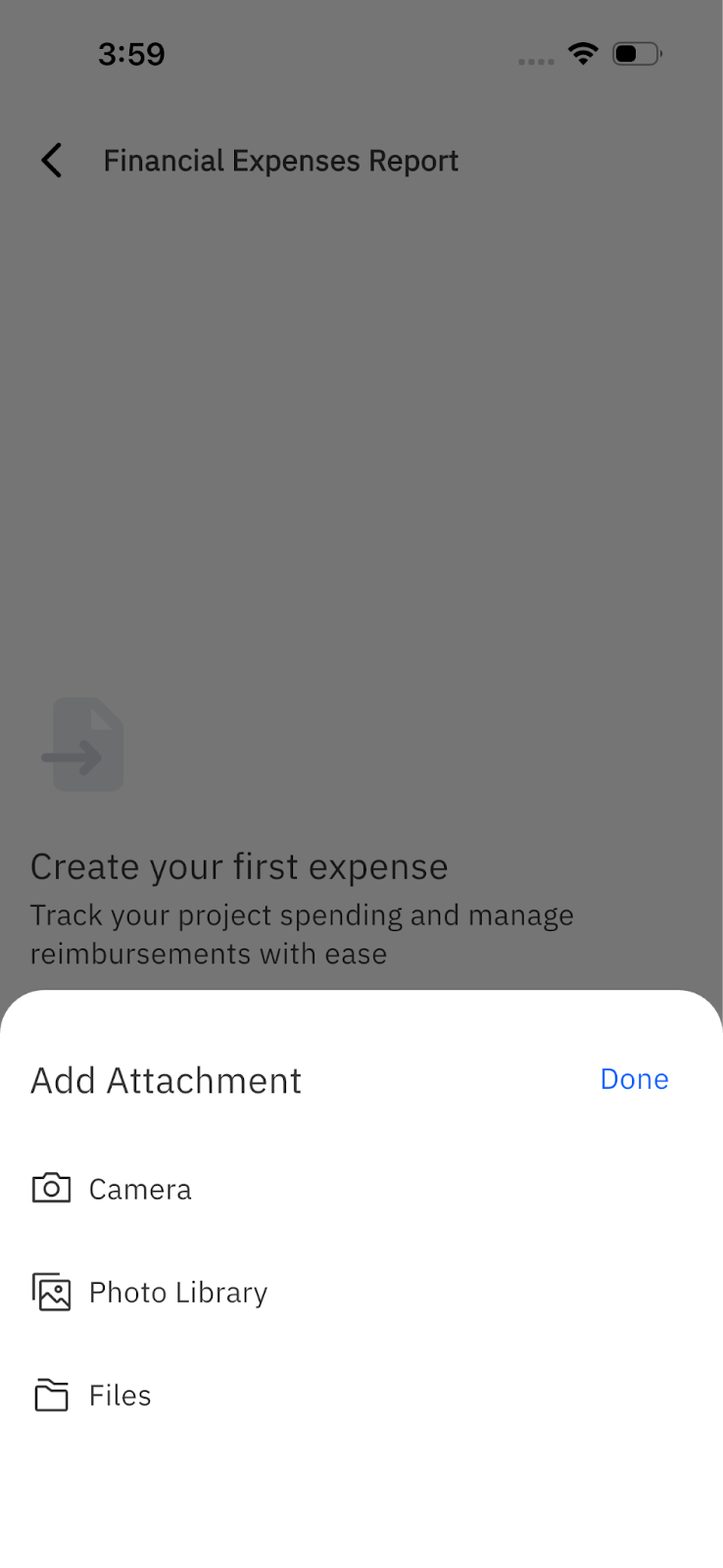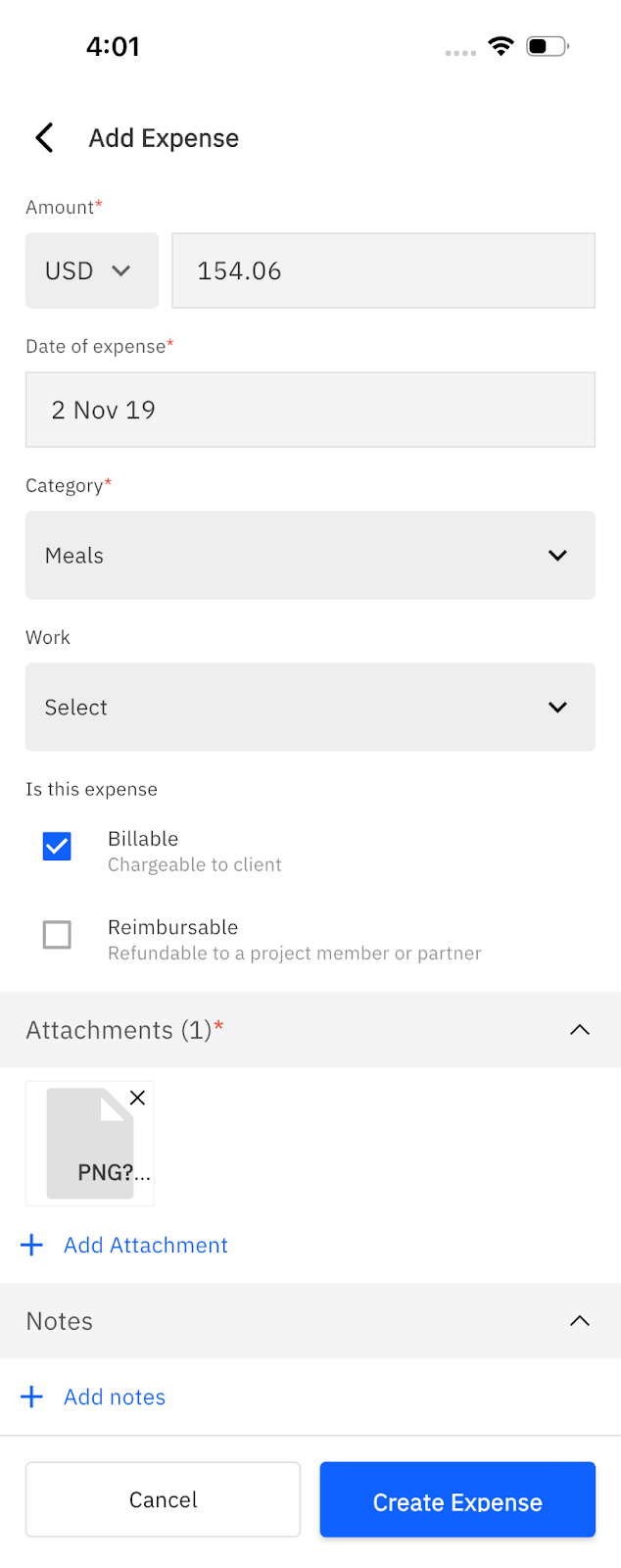 Fill out the necessary expense fields, including any custom fields configured in the Rocketlane workspace, and then tap Create Expense.