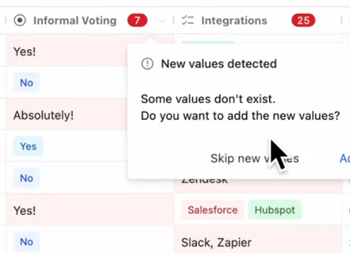 When new values are introduced to a Select or Multi-select column that are not present in the existing dropdown setup, (for instance, pasting "Intercom" into an "Integrations" column where it hasn't been added previously), a new modal will emerge.