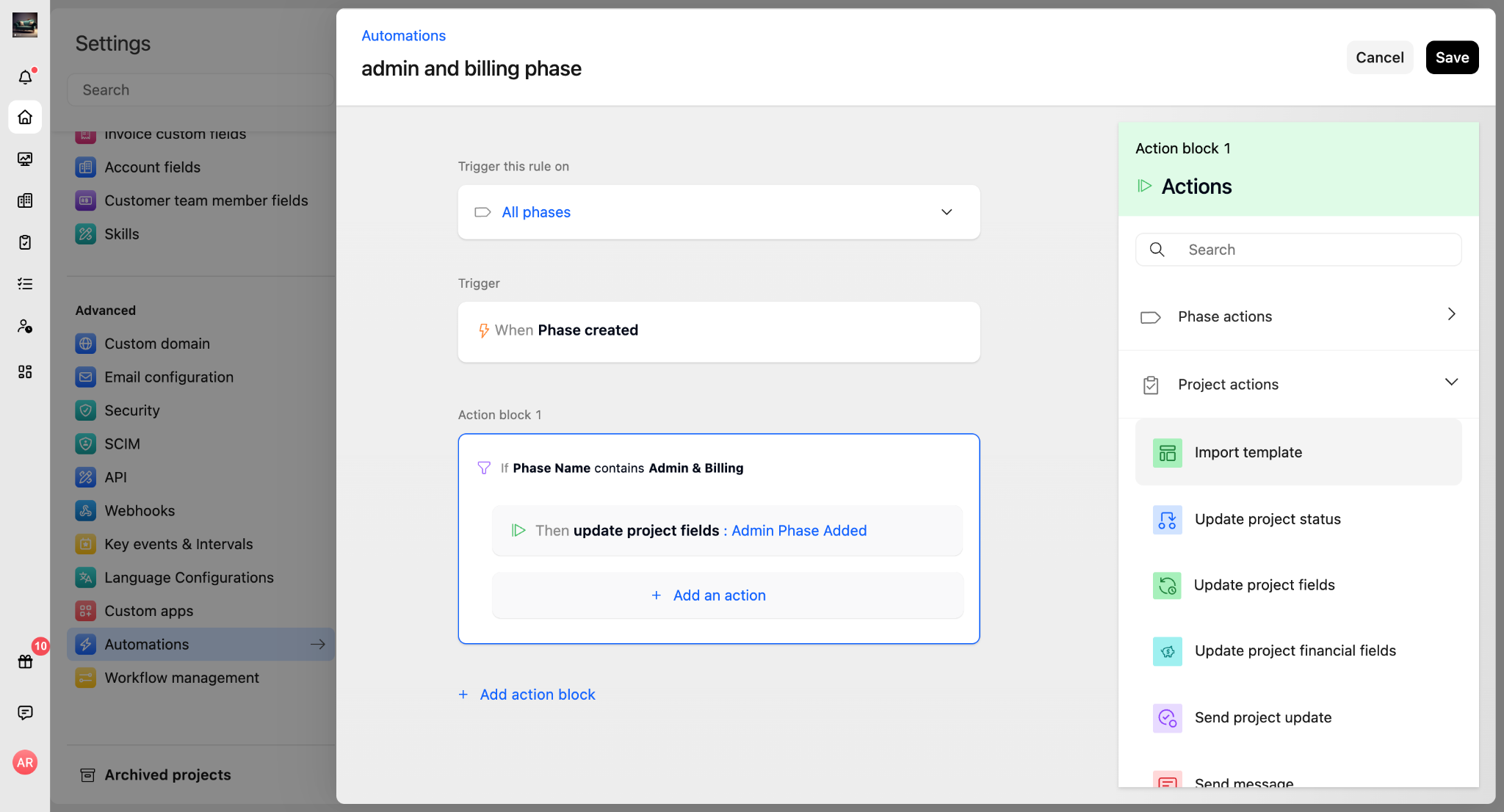 • Action: Set project field Admin & Billing Phase Added to Yes