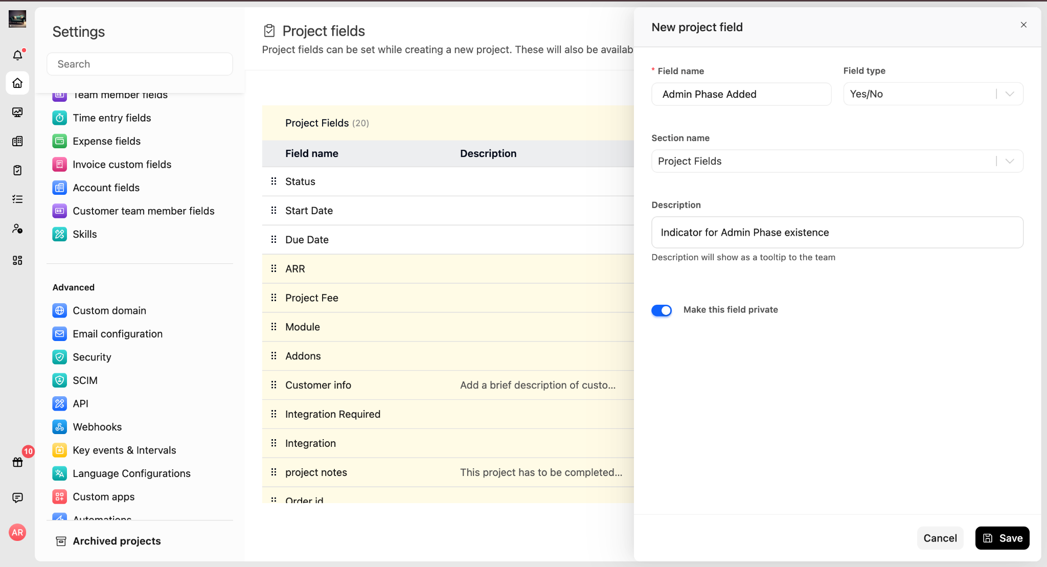 1. Go to Settings → Project Fields.